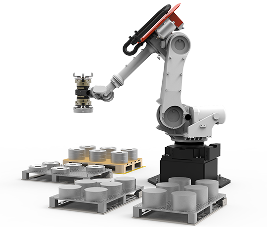 Ein Roboter bietet eine oder mehrere Palettenpositionen an auf denen die Werkstücke positioniert werden. Ein Sicherheitskonzept ist bereits integriert. Die Bedienung erfolgt über einem Industrie-PC.