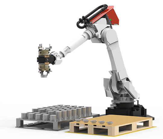 Ein Roboter bietet eine oder mehrere Palettenpositionen an auf denen die Werkstücke positioniert werden. Ein Sicherheitskonzept ist bereits integriert. Die Bedienung erfolgt über einem Industrie-PC.